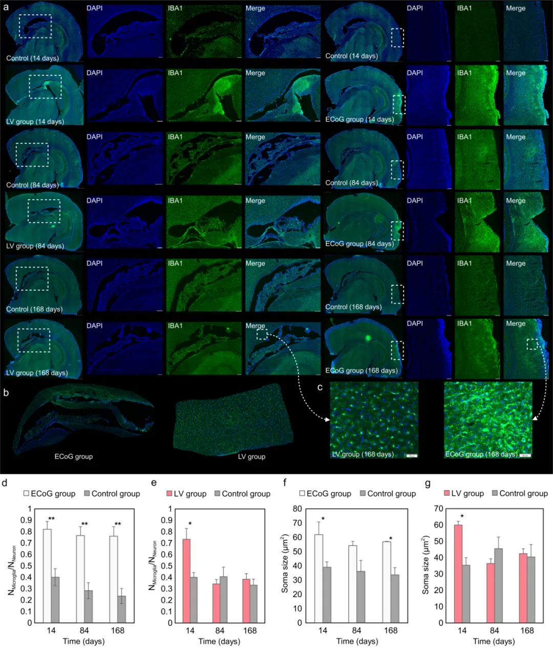 Immunohistochemistry results further revealed persistent microglial activation surrounding the cortical electrodes, whereas the ventricular electrode only elicited a transient response in the early post-operative period, subsequently returning to near-control levels. These results suggest that placing the electrode within the cerebrospinal fluid environment and reducing direct mechanical coupling with brain parenchyma helps mitigate chronic inflammatory responses, thereby supporting long-term stable recording.