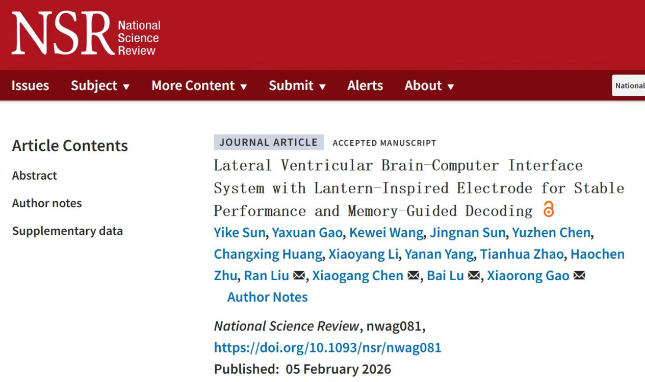 Addressing this issue, the research teams led by Professor Xiaorong Gao and Professor Ran Liu from the School of Biomedical Engineering at Tsinghua University, Professor Bai Lu from the School of Pharmaceutical Sciences, and Professor Xiaogang Chen from the Chinese Academy of Medical Sciences, published a research paper online in the journal National Science Review on February 5, 2026, titled "Lateral Ventricular Brain-Computer Interface System with Lantern-Inspired Electrode for Stable Performance and Memory-Guided Decoding."