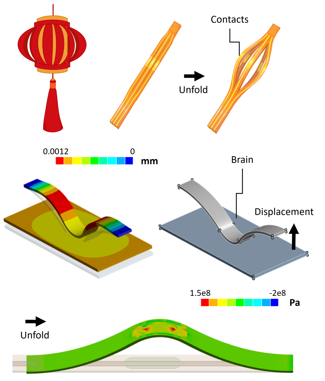 Centered on this concept, the research team designed a lantern-inspired expandable flexible electrode. During implantation, the electrode remains in a collapsed state, and after being delivered through a narrow channel to the target location, it radially expands to form a gentle conformal contact with the ependymal wall. The structural design draws inspiration from the force-bearing mechanism of a lantern, using bow-shaped support units to disperse contact stress and reduce mechanical irritation to the ependyma. Finite element analysis results indicate that, compared to rigid structures, this design significantly reduces the deformation level of the ependymal wall and maintains material stress within a safe range during deployment.