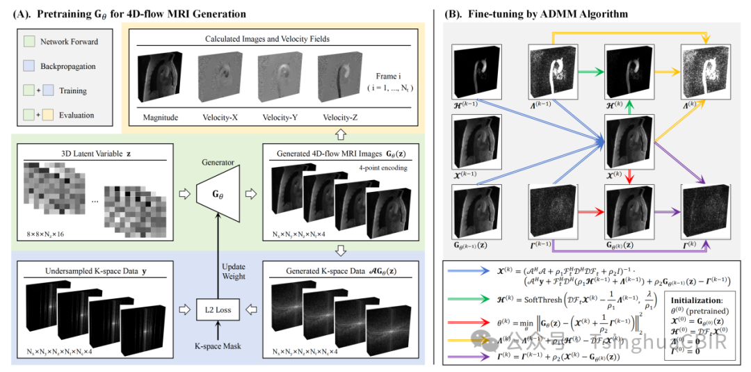 ·生成-稀疏联合约束的重建模型,以及预训练-ADMM微调的二阶段优化算法,可实现生成器与4D-flow MRI图像的交替式高效优化