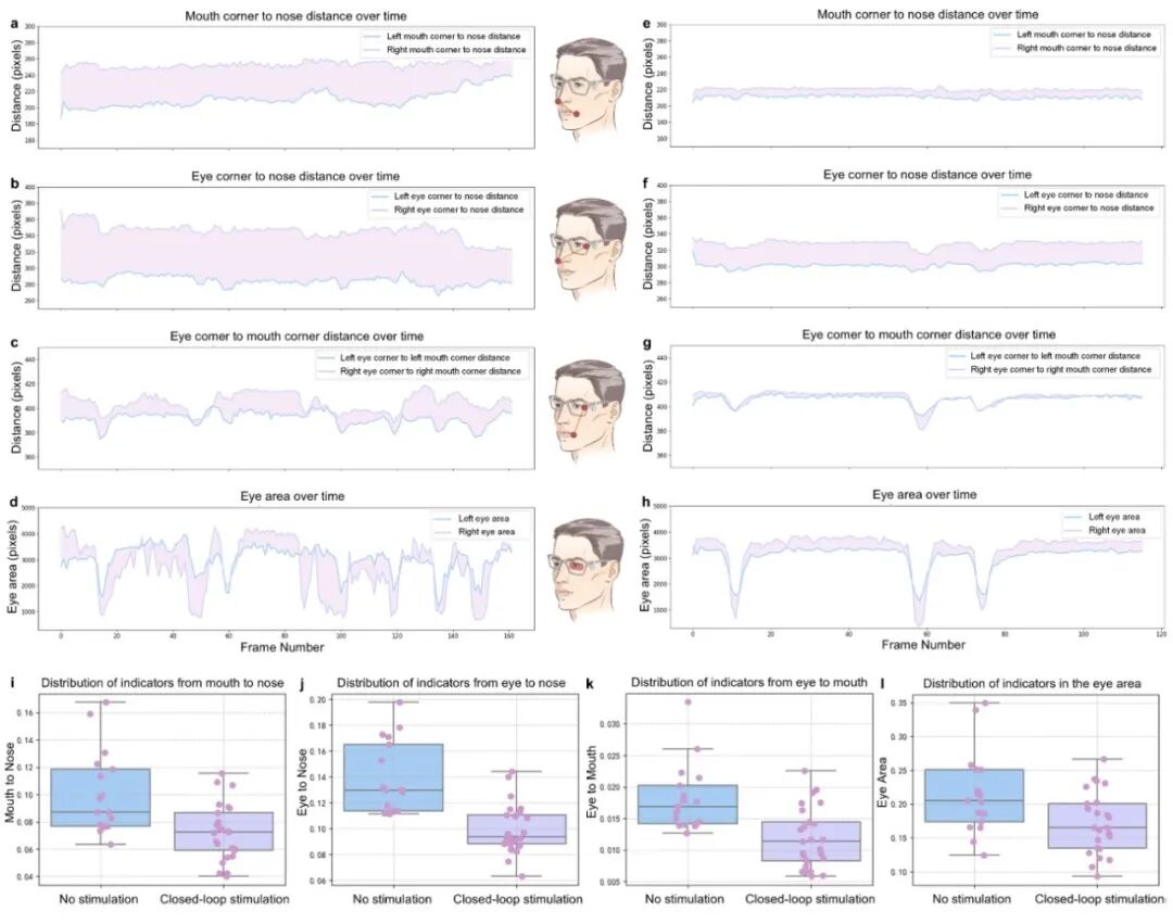 研究团队在清华大学玉泉医院神经外科共招募4位面肌痉挛患者开展临床实验。实验通过同步视频记录并对痉挛发作进行标注,结果显示系统痉挛识别准确率达98.0%;为客观评估闭环神经调控效果,研究团队引入基于计算机视觉的人脸关键点分析方法,利用人脸网格模型提取三维人脸关键点,并通过归一化左右差异指标量化面部对称性变化,实验结果表明接受干预患者在多项对称性指标上得到显著性改善。