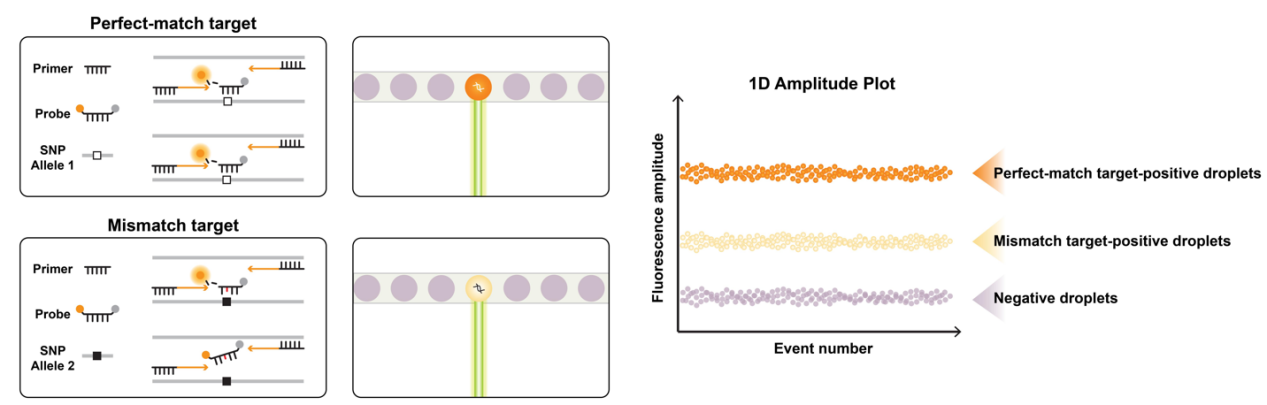 单探针双等位基因区分技术:利用一种优化的单TaqMan探针同时区分两个等位基因,通过精准热力学调控,仅凭荧光强度差异即可实现SNP分型。