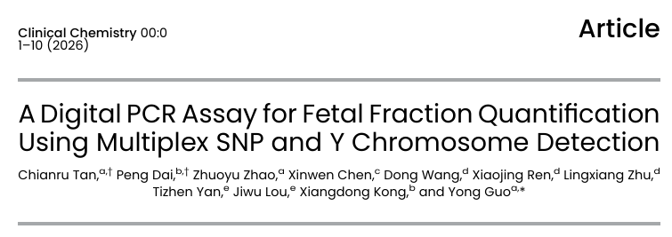 近日,清华大学生物医学工程学院郭永教授团队联合郑州大学第一附属医院、湖南医药学院、东莞市妇幼保健院和北京新羿生物,开发了一种基于多重单核苷酸多态性(Single Nucleotide Polymorphism, SNP)和Y染色体联合检测的数字PCR胎儿分数定量新方法。该方案通过创新的单探针双等位基因识别设计和三重Y染色体靶标策略,实现了无需父母基因分型、不依赖胎儿性别的FF精准定量,为基于数字PCR的产前游离DNA筛查的临床转化提供了关键质控工具。相关研究成果以《一种基于多重SNP和Y染色体检测的胎儿分数定量数字PCR方法》(A Digital PCR Assay for Fetal Fraction Quantification Using Multiplex SNP and Y Chromosome Detection)为题,于2026年2月26日发表在《Clinical Chemistry》期刊。
