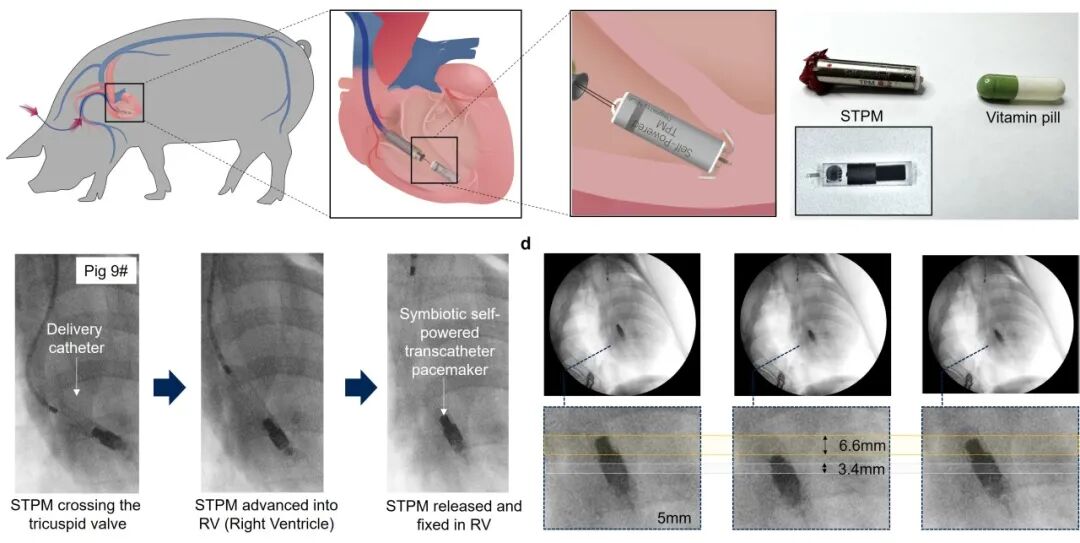 在猪三度房室传导阻滞心律失常模型中,该共生型起搏器完成了为期一个月的自主运行测试。实验期间,它持续实现能量自供给,同时稳定发挥起搏治疗功能,有效调控实验动物的心脏节律,充分验证了其临床转化可行性。