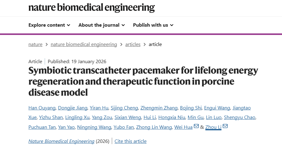 历经近七年联合攻关,李舟及其合作者中国医学科学院阜外医院华伟教授、中国科学院大学欧阳涵副教授等组成的研究团队,终于取得重要进展——成功研发出胶囊尺寸的微型共生型自供电无导线心脏起搏器。相关研究成果以“共生型经导管起搏器在疾病模型中实现终身能量再生与治疗功能”(Symbiotic transcatheter pacemaker for lifelong energy regeneration and therapeutic function in porcine disease model)为题,于2026年1月19日在《自然生物医学工程》(Nature Biomedical Engineering)上发表。