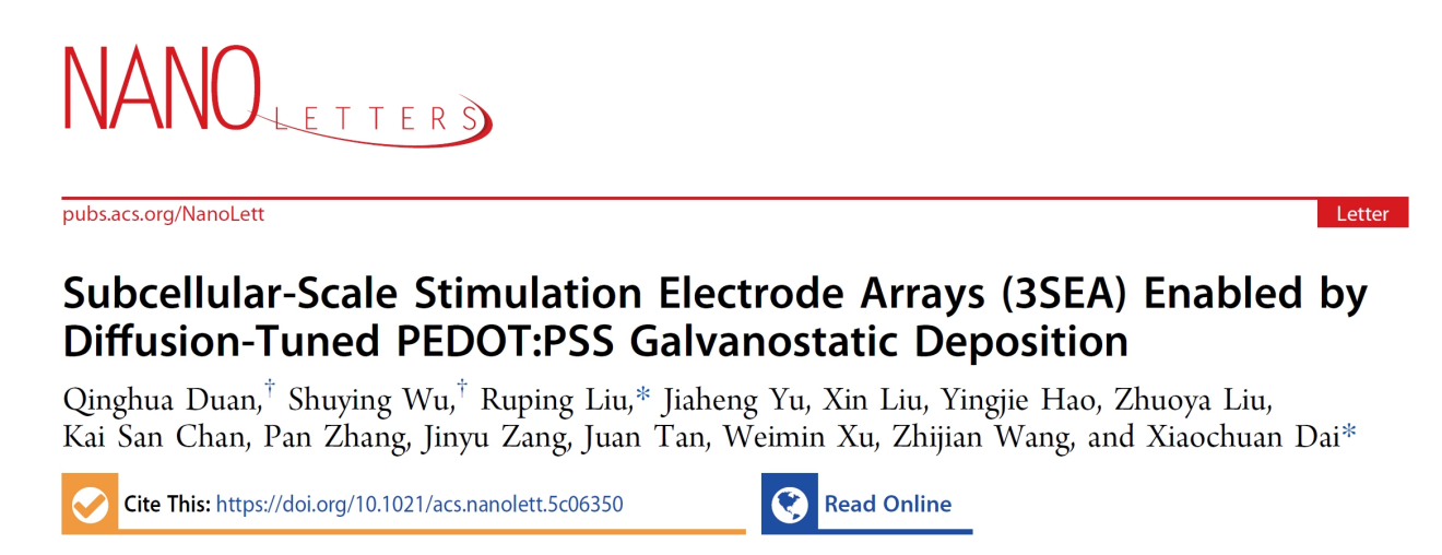 清华大学生物医学工程学院戴小川副教授团队跳出了传统“对抗”沉积不均的思路,转而从电化学最基础的稳态扩散理论中汲取灵感。研究团队意识到,微米级电极的沉积过程本质上是一个高度受限的扩散调控过程。通过精确计算超微电极的稳态极限电流(Iss),团队创新性地提出了扩散调控的恒流沉积策略(Diffusion-Tuned Galvanostatic Deposition)。这一策略的核心在于“顺应”自然界的物理约束:将沉积电流严谨地限定在理论极限以下,使单体分子的消耗速度与扩散补充达成动态平衡,从而为每一个微小电极构建了稳定的质量传输环境。这种方法不仅消除了生长溢出,更在全阵列范围内实现了高度均一修饰,为高密度电极阵列的批量修饰提供了可靠的技术框架。相关研究成果以 “Subcellular-Scale Stimulation Electrode Arrays (3SEA) Enabled by Diffusion-Tuned PEDOT:PSS Galvanostatic Deposition ”为题,于2026年3月3日在线发表在纳米领域权威期刊《 Nano Letters 》上。