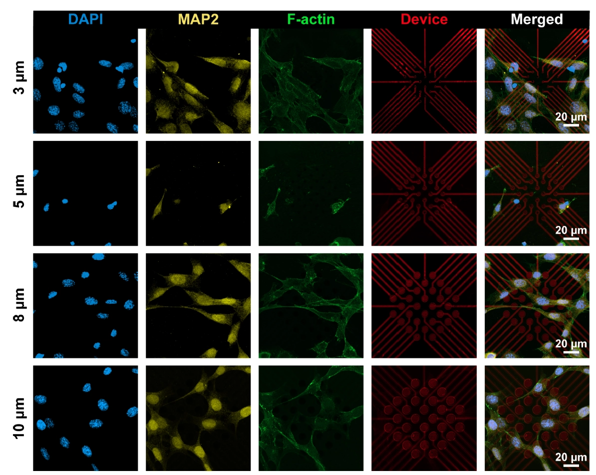 图4:HT-22 细胞在 3SEA 阵列上的粘附生长情况及亚细胞尺度尺寸对比。