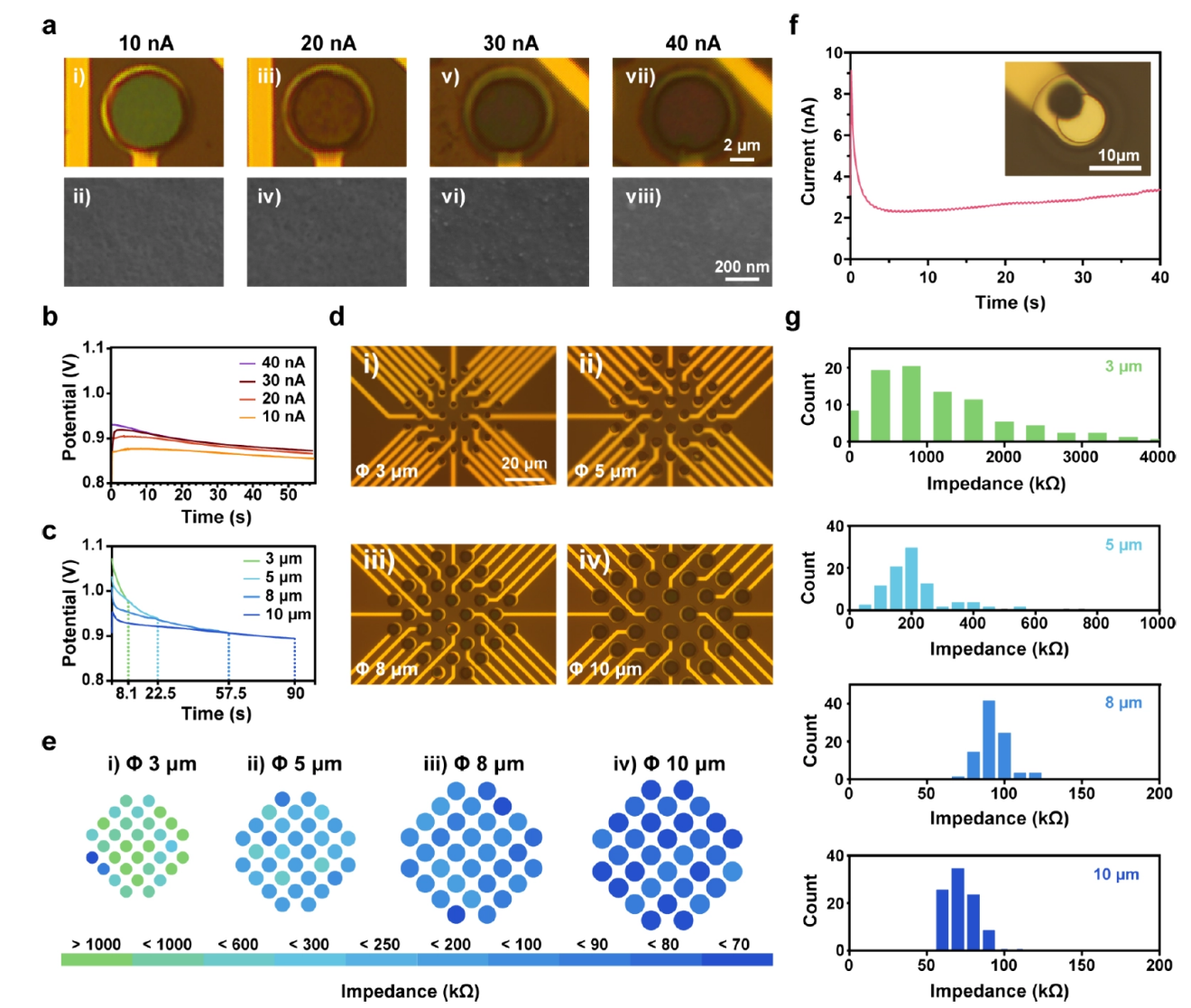 研究团队通过建立超微电极稳态扩散模型,计算出不同尺寸电极的极限电流Iss,并以此指导恒流沉积参数。实验证实,当阵列上的每个通道的电流均控制在 Iss以下时,电位稳定在最佳聚合窗口,形成的 PEDOT:PSS 薄膜形貌均匀且无边缘溢出。相比之下,传统的恒电位法会导致严重的边缘偏向成核。这种基于物理约束的调控,确保了多通道阵列在阻抗分布上表现出一致性。