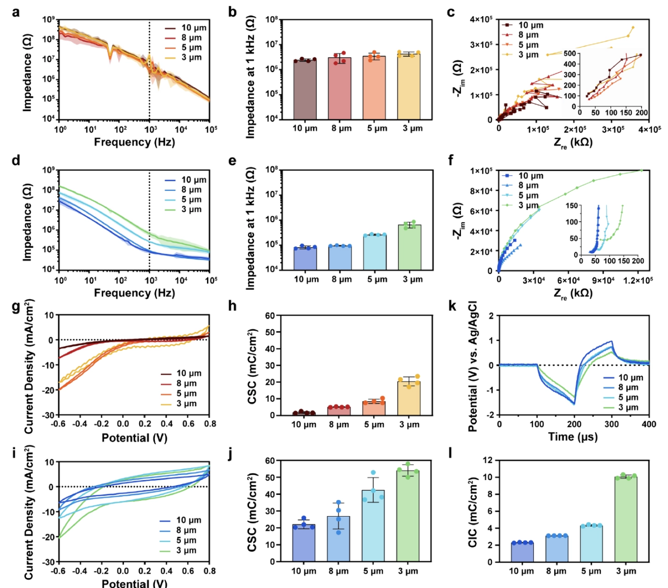PEDOT:PSS 的引入不仅使界面阻抗降低了 6-30 倍,更通过构建高度多孔的离子-电子混合导电网络,大幅提升了电荷存储能力(CSC)与电荷注入能力(CIC)。这种在亚细胞尺度有效面积下依然稳健的电荷传递能力,为实现安全、高效神经刺激的提供了关键技术支撑。