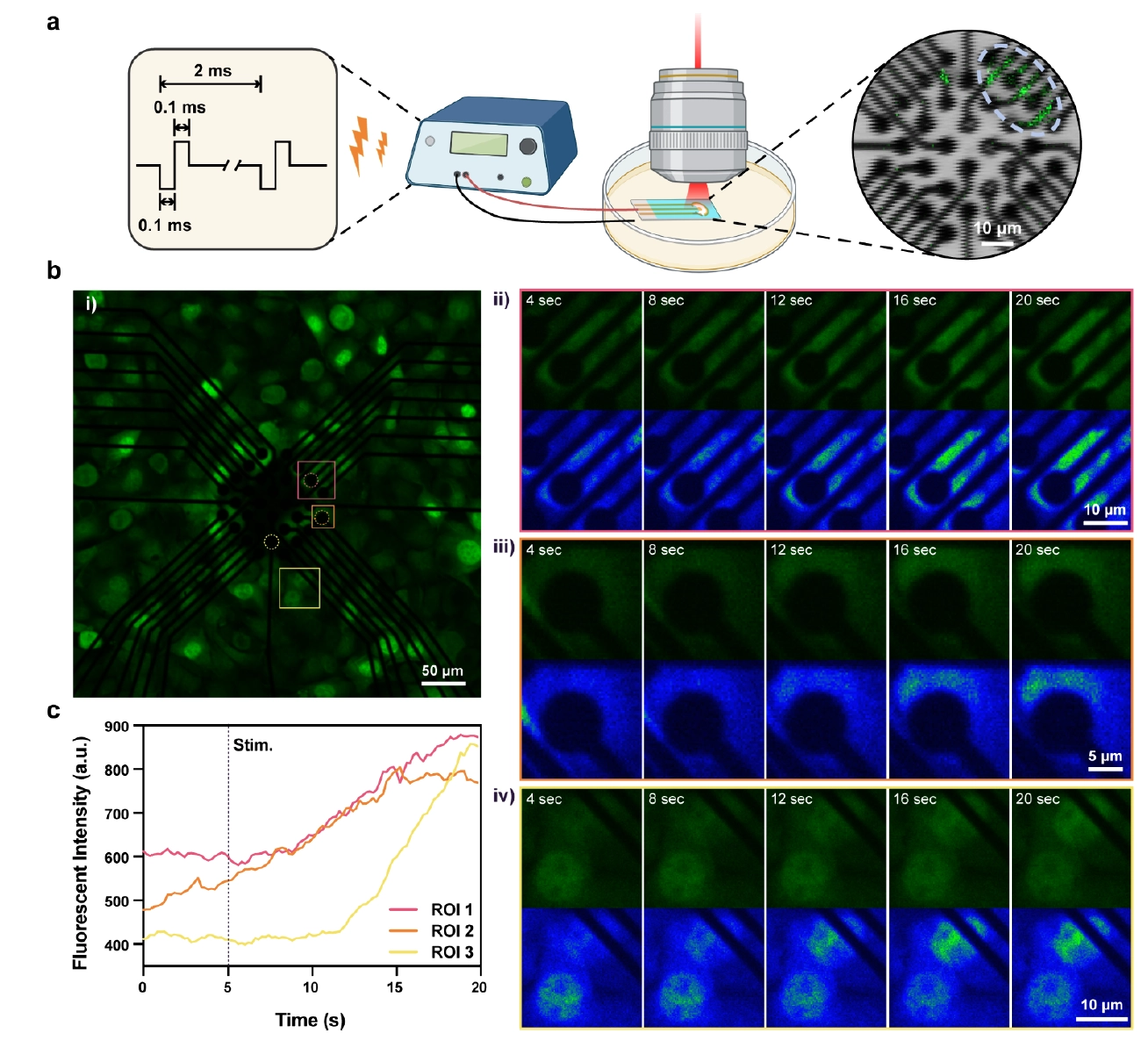 研究团队进一步将 HT-22 细胞培养于3SEA阵列上,荧光成像清晰展示了电极尺寸与神经元微观结构的比例关系:10 μm 级别的电极已略小于神经元胞体,而 3-5 μm 的电极则能够精准对准神经突触等更细微的亚细胞结构。功能性神经刺激实验证明,3SEA仅需 1 nC/phase 的低电荷量双相脉冲,即可精准诱发目标神经元的胞内钙离子瞬变。时空动力学分析显示,钙信号严格起始于电极与细胞膜接触的 ROI 区域,随后才向胞体其他部位扩散。与之形成对比的是,未修饰的电极在同等电荷下极易因水分解析氢而损伤细胞,进一步突显了 3SEA 技术的生物安全性与刺激高效性。