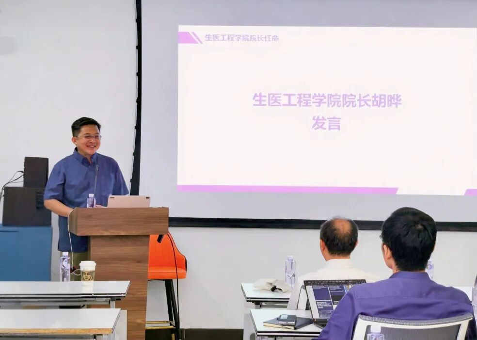 新任院长胡晔教授在发言中衷心感谢学校党委的信任和全院师生的支持。他表示,将全力以赴、恪尽职守,以高度的责任感和使命感履行院长职责。围绕未来学院发展,胡晔提出以“公平、拓展、创新、精进”为核心理念的工作方向:通过严明的制度建设和统筹协调多方资源,营造公正、透明、包容的学术环境,让每一位教师和学生都能获得平等的发展机会;深化产学研合作,拓展国际合作与交流,提升学科影响力和竞争力,为学院发展开拓新局面;强化跨学科交叉融合,推动科研原创突破与人才培养模式创新;注重内涵式发展,提升管理效能与教育科研质量,实现可持续发展。他表示,将与全院师生一道,共同致力于将生物医学工程学院建设成为具有国际水准、融合生物医学与工程前沿的一流学院。