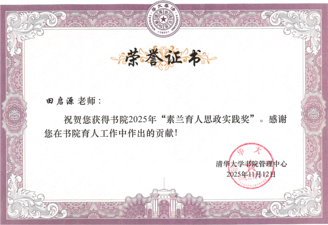 田启源老师始终遵循习近平总书记指出的“思政课不仅要在课堂上讲,也要在社会生活中讲”这一指导方向,将立德树人作为教育的根本任务,秉持清华大学“三位一体”教育理念,积极探索将思政教育融入科研实践、社会服务与学生成长全过程的创新模式,努力培养胸怀家国、敢于担当的时代新人。