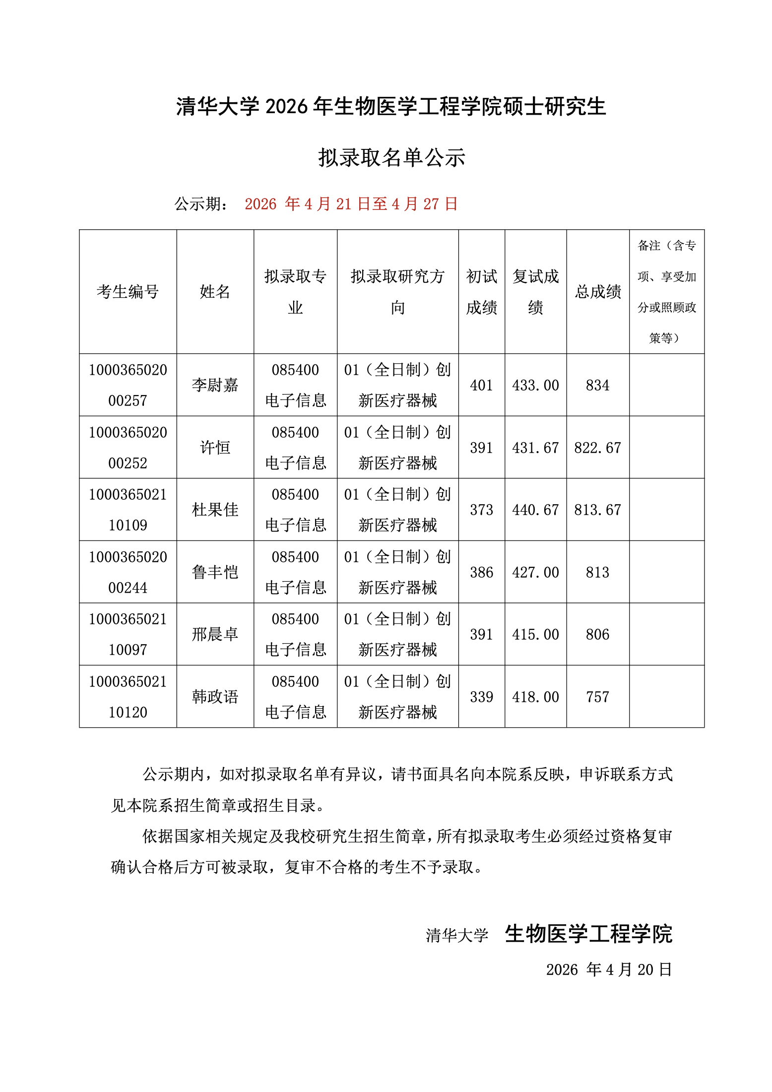 清华大学2026年生物医学工程学院硕士研究生拟录取名单现予以公示