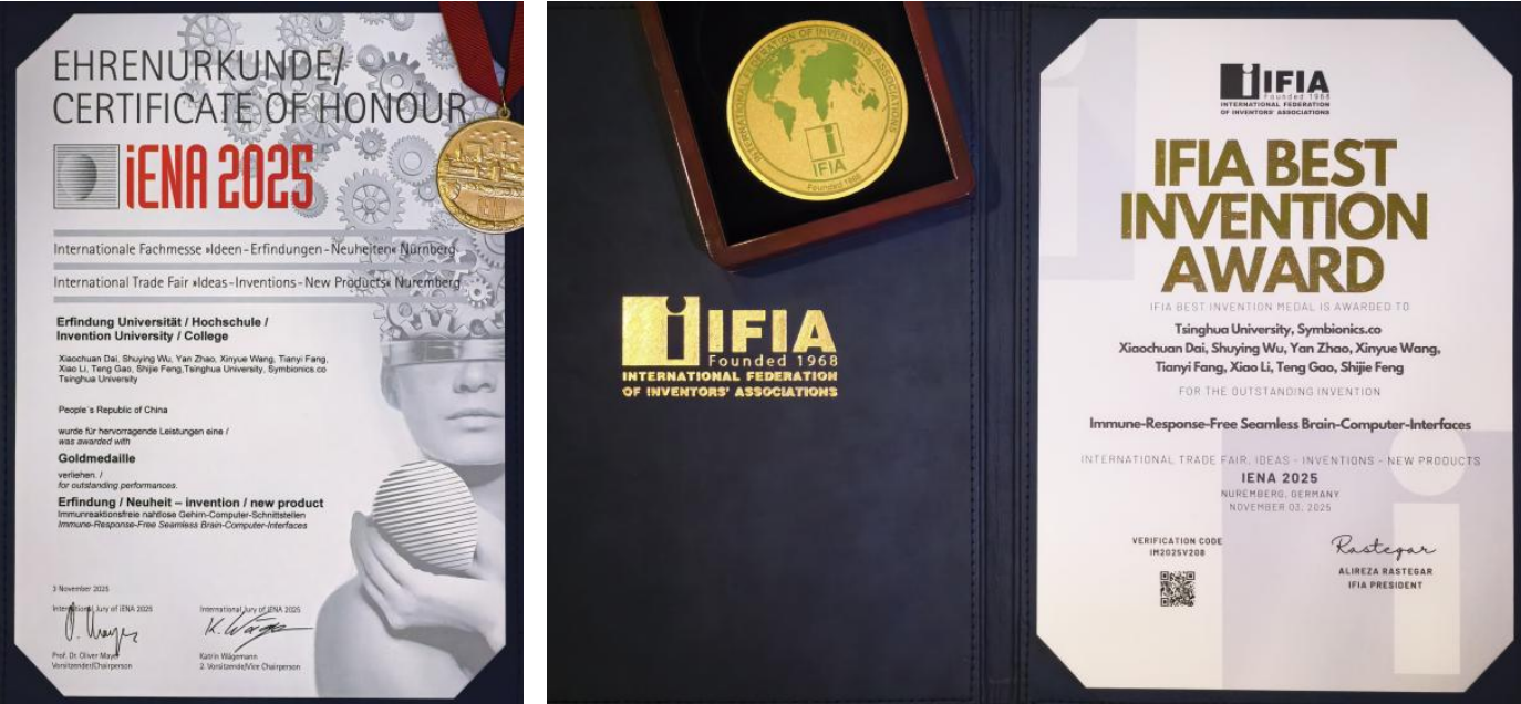2025年11月1日至3日,第77届德国纽伦堡国际发明展于当地国际展览中心盛大召开。由清华大学生物医学工程学院戴小川团队领衔、联合和泽启元(北京)科技有限公司研发的“零排异人机无缝融合脑机接口系统(Immune-Response-Free Seamless Brain-Computer-Interfaces)”亮相展览,从全球21个国家和地区的540项前沿科技成果中脱颖而出,斩获纽伦堡国际发明展金奖与国际发明者协会联合会(IFIA)最佳发明奖。 纽伦堡国际发明展金奖(...